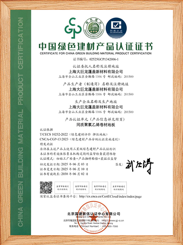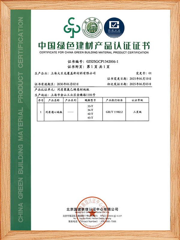 1. حصل على شهادة FloorScore في الولايات المتحدة 2. أعيد منحها شهادة ‘أفضل جمعية للتبرع بالدم في منطقة جينشان، شنغهاي’ 3. تم تكريم رئيسنا باعتباره ‘شخصية بارزة في صناعة المفروشات المنزلية ومواد البناء بمناسبة الذكرى السبعين لتأسيس جمهورية الصين الشعبية’